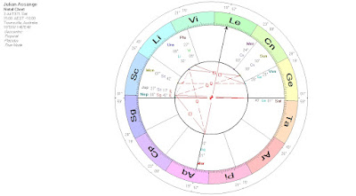 Combining information gleaned from Tarot cards with astrology can reveal surprising details. Julian Assange’s case is used as an example here to illustrate the method. One of the most important configurations in Julian’s chart is a Jupiter[27sc17]-Neptune[0sa42] conjunction opposite Saturn [1ge40] aligned with the horizon axis.